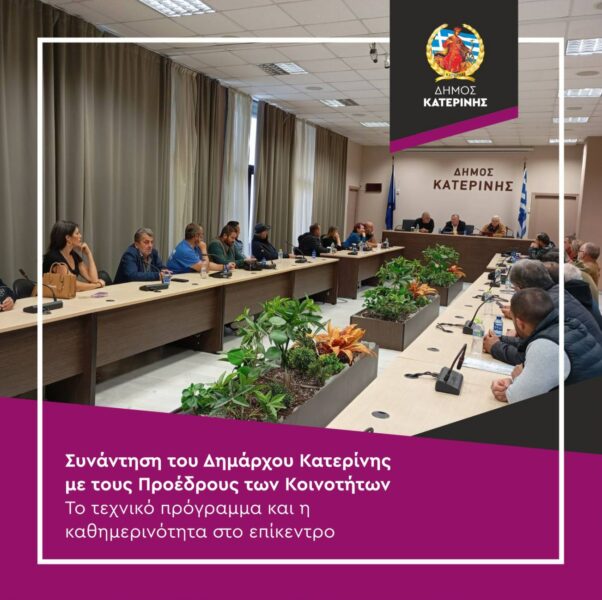 Στη συζήτηση για τη διαμόρφωση του τεχνικού και επιχειρησιακού προγραμματισμού του Δήμου, με στόχο την ενσωμάτωση των προτάσεων και αναγκών των Κοινοτήτων επικεντρώθηκε η συνάντηση του Δημάρχου Κατερίνης, Ιωάννη Ντούμου με τους προέδρους των Κοινοτήτων.