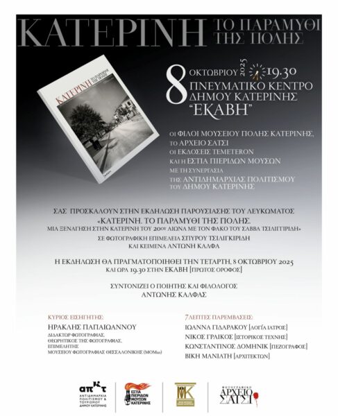 Οι Φίλοι Μουσείου Πόλης Κατερίνης, το Αρχείο ΣάΤσι, οι εκδόσεις Τεμέτερον και η Εστία Πιερίδων Μουσών σας προσκαλούν στην εκδήλωση παρουσίασης του λευκώματος Κατερίνη. Το παραμύθι της πόλης. Μια ξενάγηση στην Κατερίνη του 20ου αιώνα με τον φακό του Σάββα Τσιλιγγιρίδη, σε φωτογραφική επιμέλεια του Σπύρου Τσιλιγκιρίδη και κείμενα του Αντώνη Κάλφα. Η εκδήλωση θα πραγματοποιηθεί την Τετάρτη 8 Οκτωβρίου και ώρα 19:30 στην αίθουσα του ορόφου του Συνεδριακού Κέντρου του Δήμου Κατερίνης (ΕΚΑΒΗ). Θα μιλήσει ο Ηρακλής Παπαϊωάννου Δρ. Φωτογραφίας και θα συμμετάσχουν με σύντομες παρεμβάσεις οι Ιωάννα Γιδαράκου, Νίκος Γραίκος, Κωνσταντίνος Δομηνίκ και Βίκη Μανιάτη.