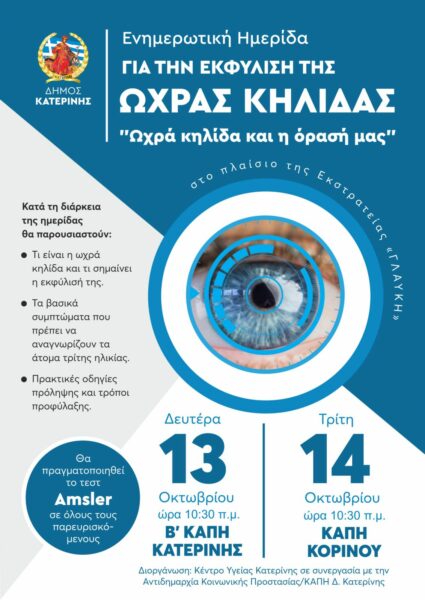 Με αφορμή την Παγκόσμια Ημέρα Όρασης, το Κέντρο Υγείας Κατερίνης, σε συνεργασία με τα ΚΑΠΗ του Δήμου Κατερίνης, διοργανώνει ενημερωτική δράση με τίτλο: