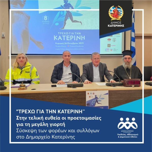 «Στις 26 Οκτωβρίου, η Κατερίνη φοράει τα αθλητικά της για να γιορτάσει την απελευθέρωσή της. Ο αγώνας δρόμου που διοργανώνουμε σε συνεργασία με τον σύλλογο “ΖΕΥΣ”, υπό την αιγίδα της Μητρόπολής μας, με την καθοριστική συμβολή της Διεύθυνσης Αστυνομίας, της Τροχαίας, αλλά και όλων όσοι βάζετε το δικό σας λιθαράκι, δεν είναι απλώς μια αθλητική εκδήλωση. Είναι ένας αγώνας, ένας ζωντανός περίπατος θα έλεγα, στην ιστορία και τη μνήμη της πόλης μας». Με αυτά τα λόγια, ο Δήμαρχος Κατερίνης, Ιωάννης Ντούμος, καλωσόρισε στη διάρκεια της σύσκεψης που πραγματοποιήθηκε σήμερα στο Δημαρχείο τους εκπροσώπους των εμπλεκομένων φορέων & συλλόγων της διοργάνωσης του αγώνα δρόμου – θεσμού «ΤΡΕΧΩ ΓΙΑ ΤΗΝ ΚΑΤΕΡΙΝΗ».
